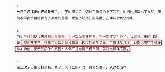 只不过这些还不够,在节目播出以后,许飞直接在微博上diss。关于为何上节目,许飞解释了说节目组第一次邀请时,她拒绝了,因为不熟,但是后来因为劳务费还是来了。