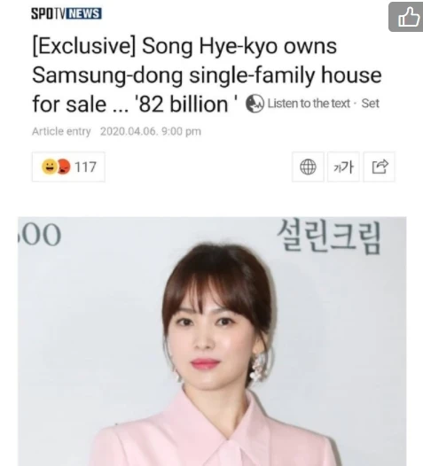 4月6日晚,韩媒又发现,宋慧乔要出售首尔三成洞的豪宅,就好像对宋仲基反击一样:你换房,我也换房!