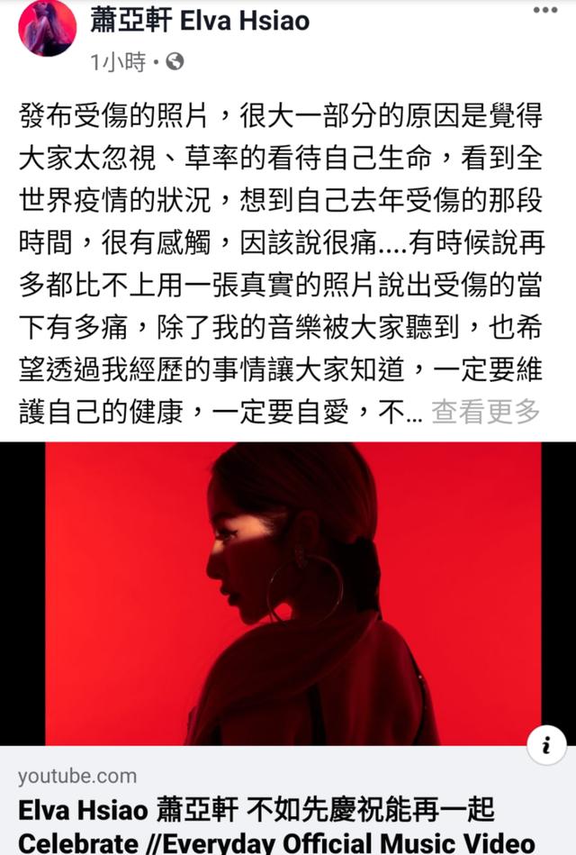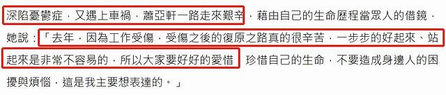 深陷忧郁症,又遇上车祸,萧亚轩一路走来艰辛,这次萧亚轩在社交网站自曝:“去年,因为工作受伤,受伤之后的复原之路真的很辛苦,一步步的好起来、站起来是非常不容易的,所以大家要好好的爱惜、珍惜自己的生命,不要造成身边人的困扰与烦恼,这是我主要想表达的。”