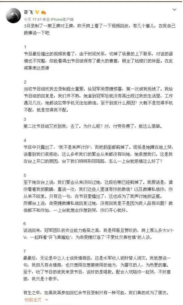 节目播出后,“许飞真尴尬”成为了各大社交平台出现的标题,许飞也自己亲自下场发长文解释,手撕尚雯婕。