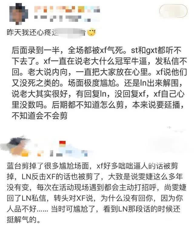 而也有到达现场的人员回应,节目组剪掉了很多火药味十足的内容,包括许飞厉娜互怼,厉娜还说,“她回复我私信了,为什么不回复你,是因为你人品不好。”