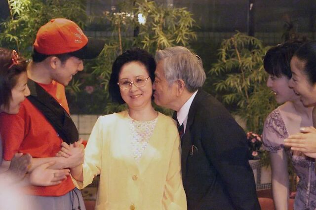 ▲在皇冠50周年宴会上,琼瑶和林婉珍儿子平云合影。
