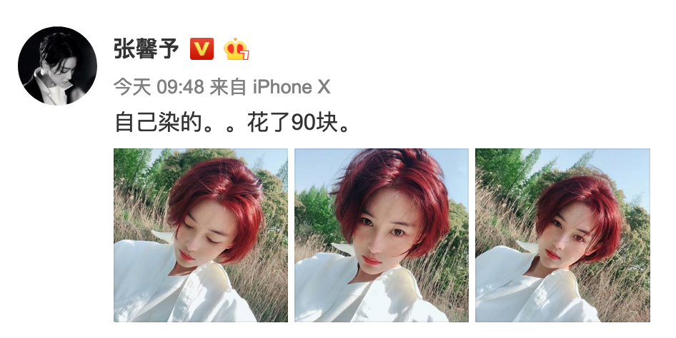 "4月8日,张馨予在微博晒出三张新发色的自"张馨予发文表示:“自己染的。。花了90块。”"照片中的张馨予留着一头红色短发造型,俏皮又减龄。"在阳光的照耀下发丝显得亮丽有光泽,少女感十足。919微信扫一扫复制下方链接,去粘贴给好友吧-张馨予宅家花90元自己染发 一头红发俏皮减龄复制链接本文由网络整理 © 版权归原作者所有