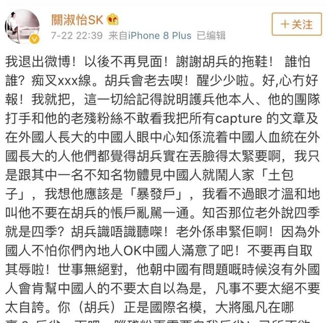 不过她第二天就删博了,真的是想破天也猜不透关淑怡为什么要cue胡兵……