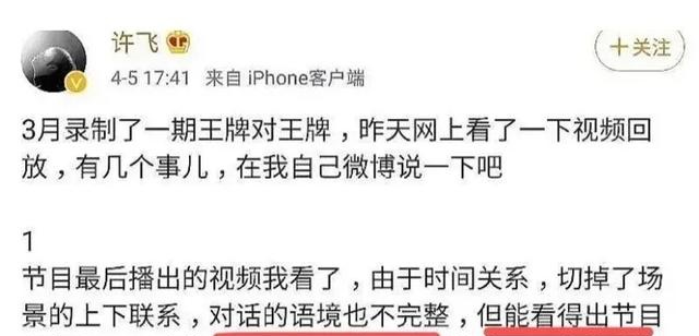 于是许飞发了条自我辩护的微博,重点包括:节目剪辑过,对话语境不完整。