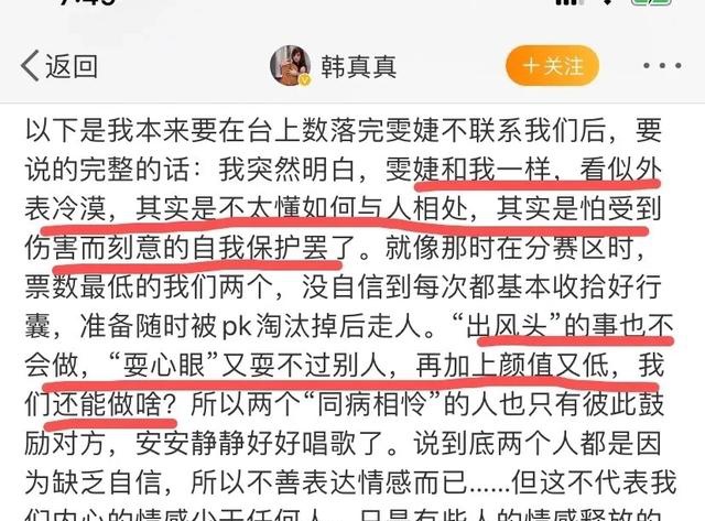 除了替尚雯婕辩护,说她外表冷漠,其实是怕受伤的自我保护;韩真真又若有所指地说,自己跟她一样,“出风头”的事不会做,“耍心眼”又耍不过别人。