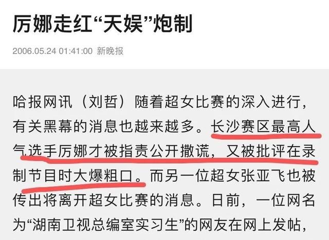 但成也公司,败也公司。厉娜在超女比赛中迅速蹿起,背后就有天娱力捧的影子。她也因此受制于天娱的局限性,比如各种博眼球的炒作手法。