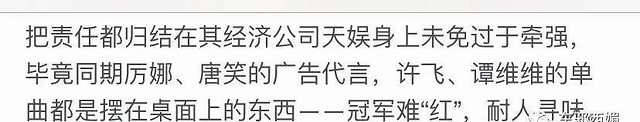 更何况公司还会暗戳戳地对媒体比较各人,尚雯婕闹解约时,天娱就对外放风说,你看厉娜唐笑许飞谭维维不都干得有声有色,冠军自己红不起来怪谁呢。