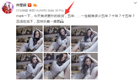 冉莹颖写到“mark一下,今天有点意外的收获,五年,一生能有多少五年?十年?十五年?且活在当下,且快乐着,感恩。”