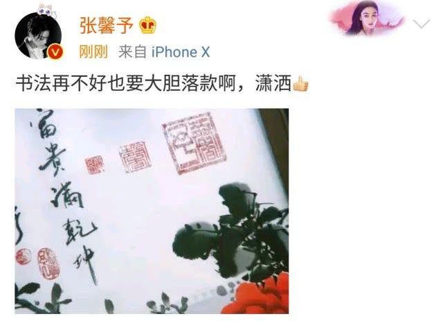 4月9日,张馨予又带来惊喜了,她在社交平台晒出了一幅书法作品,还写道:“书法再不好也要大胆落款啊,潇洒”。表面上看张馨予是在调侃自己的书法不好,但是怎么语气中却让人感觉到了满满的自信呢。当然能分享出来,说明张馨予对自己的书法还是很满意哦。