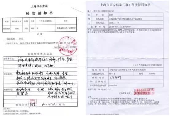 她还提供了上海市公安局的报案回执单、验伤通知书,以及医院的检验报告单。