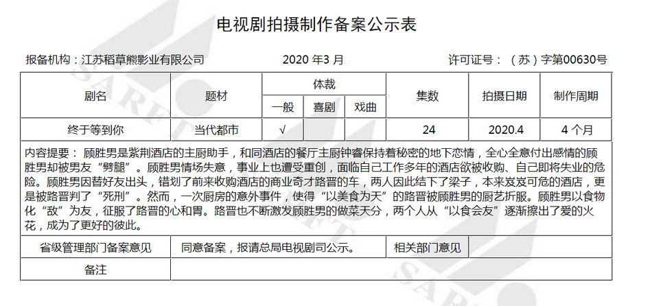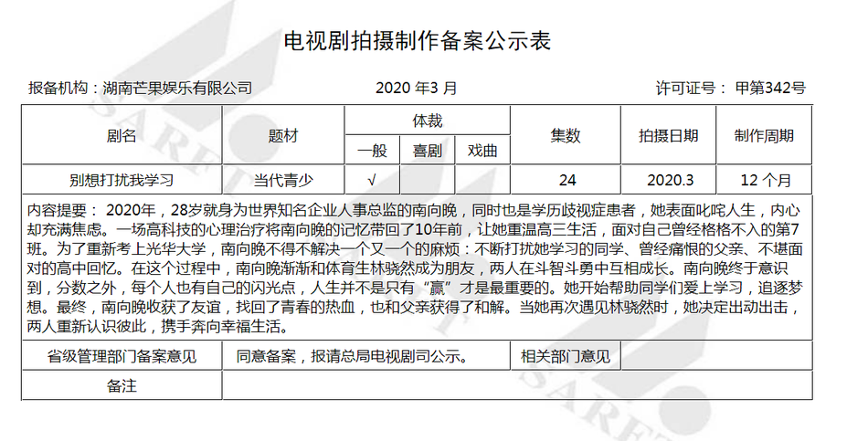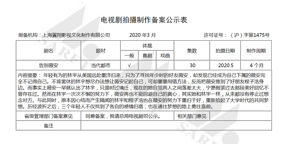4月9日,广电总局公布3月电视剧备案,安妮宝贝的《告别薇安》、月流光小说《别想打扰我学习》将拍剧;蓝白色小说《终于等到你》也将拍成电视剧,该书之前曾拍过电影版,名为《喜欢你》,由金城武、周冬雨主演;方白羽的《千门》系列小说也将改编成电视剧《云襄传