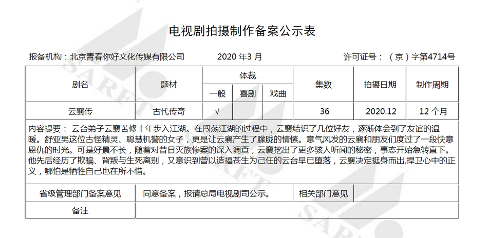 方白羽的《千门》系列小说改编成电视剧《云襄传》。