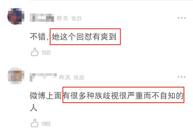 她霸气的回答获得了很多网友的赞赏,有人说“她这个回怼有爽到”,还有人称其实还有很多有种族歧视而不自知的人。