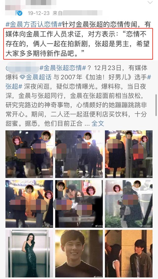 但当时金晨工作室在第一时间出面辟谣,称两人不存在恋情的问题,张超是新剧男主,金晨与其只是在一起拍新剧。