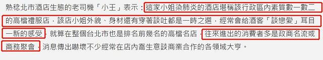 有了解酒店公关行业的网友表示:“该酒店堪称行业内素质数一数二的高档礼服店,该店小姐外貌、身材还有穿着谈吐都是一时之选,经常会给酒客‘谈恋爱’耳目一新的感觉,就算在整个台北市也是排名前几的高档名店。往来进出的消费者多是富商名流或商务聚会。”