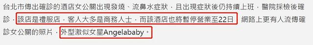 4月9日,据台媒报道,台北市某高级酒店女公关被确诊为新冠肺炎患者,且出现症状后照常上班,接触者至少50人,引发民众恐慌。确诊女公关的美照也在网上疯传,发现她神似女神baby,引起热