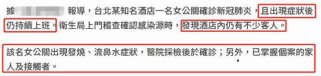 昨日惊曝台北知名酒店内的一名女公关确诊新冠肺炎,且出现症状后继续上班,当相关部门上酒店调查时,发现仍有30名小姐上班,也有不少顾客,店内顾客全然不知有女公关患病,当看到防疫工作人员上门都吓了一跳,在当得知实情后,直接脸色大变,结账走人。