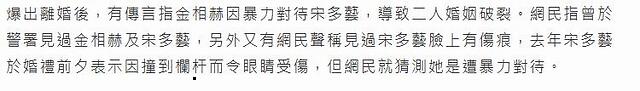 4月8号,有媒体报道称,有传闻指金相赫夫妻离婚的原因是男方暴力对待妻子,甚至有网友爆料称自己曾在警局见过金相赫和宋多艺,还有网友声称见过宋多艺脸上有伤。