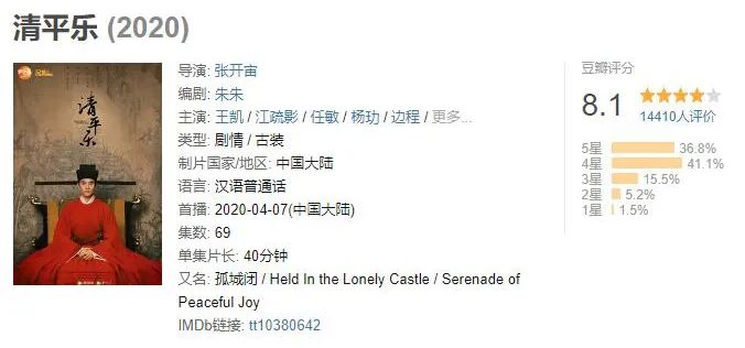 讲真,对于一部电视剧来说,豆瓣8.1分算是一个蛮高的分数了,能够超过8分的剧基本都是好剧了,不过对于《清平乐》而言,8.1分只能说是常规操作,因为正午阳光出品的电视剧,口碑普遍都高,8分左右算是到了平均水平。