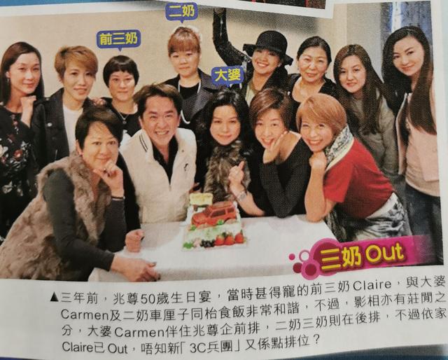 三年前,邓兆尊50岁生日宴上,当时甚是得宠的小四Claire、与正宫老婆及小三cherry同桌吃饭非常和谐,合影时,正宫和邓兆尊占据C位,彰显地位,两位小老婆就在后排。