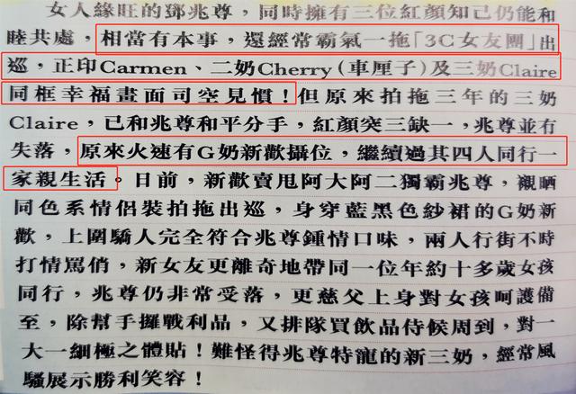 资产过亿的邓兆尊同时拥有三位红颜知己,且女友们能和睦相处,经常看到他一人带着三位女友出行,正宫Carmen、小三cherry和小四Claire和谐同框的画面也是司空见惯,不过日前邓兆尊与交往3年的小四和平分手,女友团突然三缺一,但是他也没失落,火速勾搭新欢补位,看来在处理“后宫”方面,邓兆尊是相当有本事。
