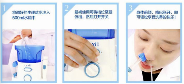 买洗鼻器,卖家会附送洗鼻器的生理盐水,然后你把生理盐水混合温水倒进去,头侧着,把洗鼻器的口对着鼻子喷进去。要记住,洗鼻的时候鼻子不要呼吸,不然你会呛到,屏住气,用嘴巴呼吸