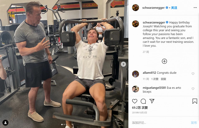 在他生日当天,施瓦辛格曾第一时间送上祝福:约瑟夫生日快乐!看着你今年从大学毕业,追随自己的热爱的事业,真是太棒了。你是一个很棒的儿子,我等不及我们的下一次训练了,我爱你儿子。