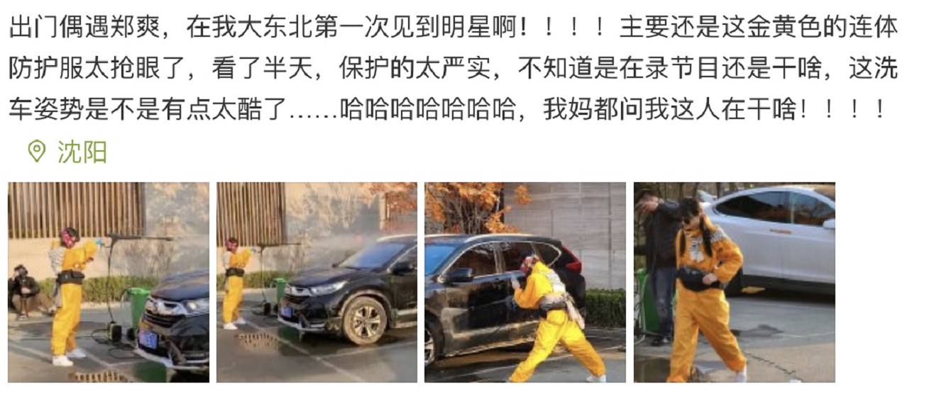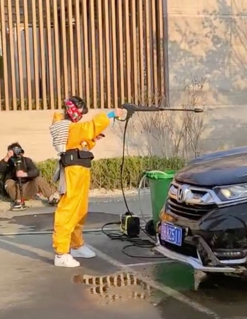 "4月10日,有网友偶遇郑爽在路边洗"她戴着墨镜,丝巾蒙面,金黄色的连体防护服实在是太抢眼啦!"不过她边洗车边劈叉看手机,这是什么高难度姿势~"郑爽路边洗车被偶遇。"郑爽路边洗车被偶遇。525微信扫一扫复制下方链接,去粘贴给好友吧-郑爽裹金黄色防护服路边洗车,还一边劈叉一边玩手机复制链接本文由网络整理 © 版权归原作者所有