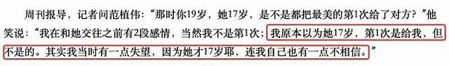 而更恶心的事情发生了,在曝光了私密照以后,范植伟在接受某家媒体采访时,突然爆料王心凌和他在一起已经是非处女的消息,还说王心凌17岁和他在一起之前,在学校交过男朋友,暗指两人当时发生过关系。