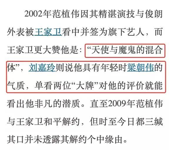 后来22岁时,范植伟被王家卫选中,当时王家卫评价他是“天使与魔鬼的混合体”,刘嘉玲也说过他是“第二个梁朝伟”,于是范植伟成了继吴恩琪、张震以后,第三个签约王家卫的演员。