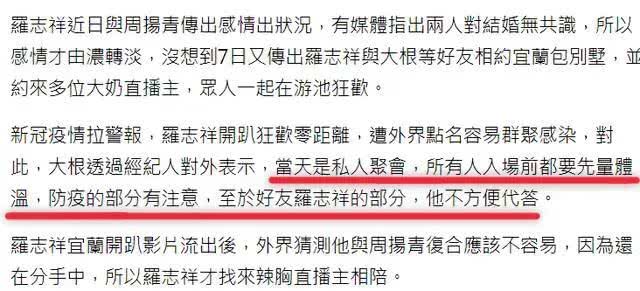 面对这个争议,同行的罗志祥的好友大根就通过经纪人对外回应了,他表示那天是属于罗志祥的私人派对,确实包了别墅,但是也有考虑到防疫的部分,每个人在入场时都会监测体温。