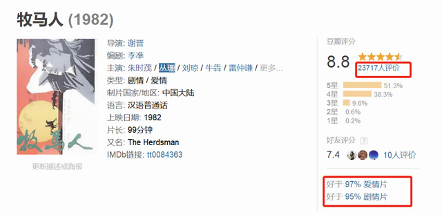 《牧马人》拍摄于1982年,上万人在豆瓣祭出8.8的好成绩,好于97%的爱情片。