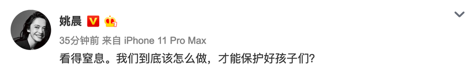姚晨痛心发问:“看得窒息。我们到底该怎么做,才能保护好孩子们?”
