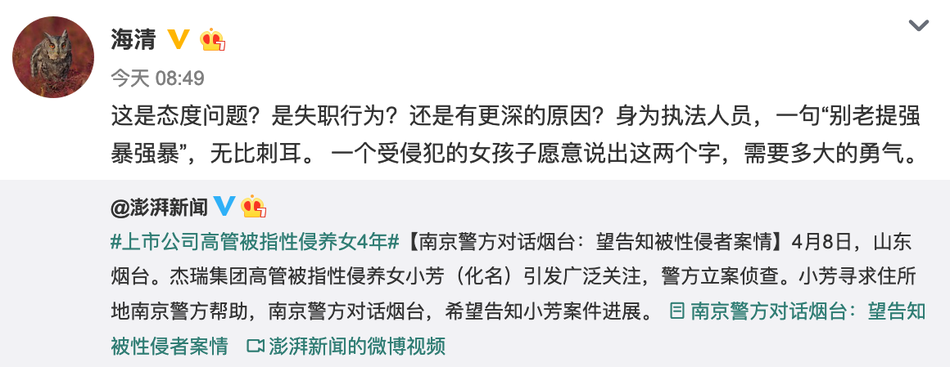 海清则表示了对案件执法人员的质疑:“这是态度问题?是失职行为?还是有更深的原因?身为执法人员,一句“别老提强暴强暴”,无比刺耳。 一个受侵犯的女孩子愿意说出这两个字,需要多大的勇气。”