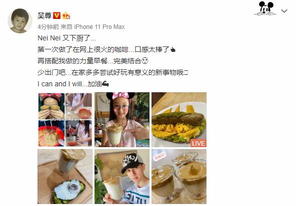 4月10日,吴尊再次在个人社交平台上晒出一组NeiNei下厨的萌照,还写道:“Nei Nei 又下厨了...第一次做了在网上很火的咖啡...口感太棒了,再搭配我做的力量早餐...完美结合,少出门吧...在家多多尝试好玩有意义的新事物哦,I can and I will...加油”。