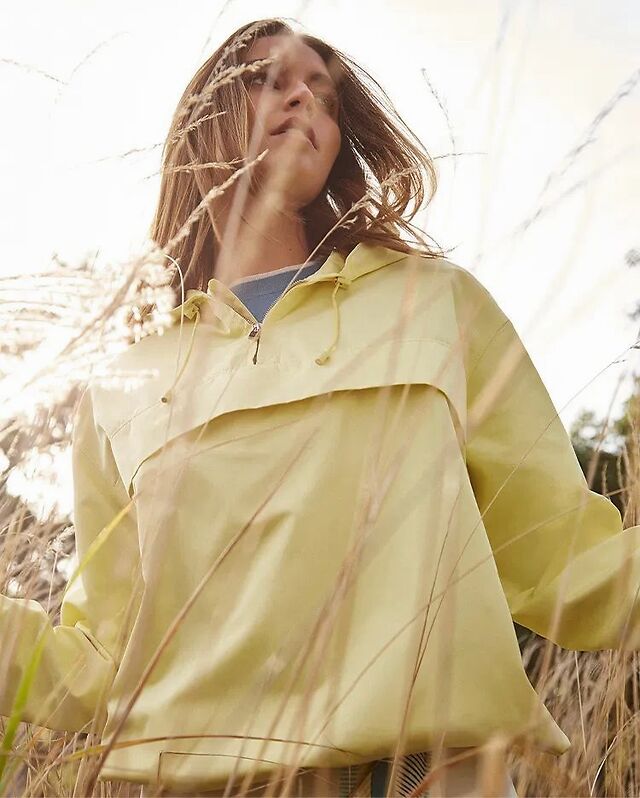 除了经典的Traveller外套之外,今年春夏还出了一件浅黄色带兜帽的卫衣ward,也用了桑蚕丝科技面料,同样防水抗皱,样子看起来更偏休闲些,远远看来自带光泽感。
