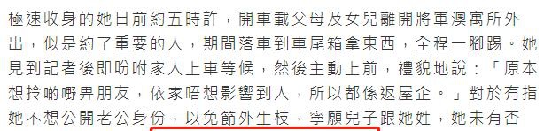 杨思琦表示本来想拿点东西给朋友,但现在不想影响到他们,所以还是先回家了,对于她不想公开老公的身份,就连儿子都随她姓一事,杨思琦没有否认,不过也只是简单的回复:“我不回应啦,多谢关心”。