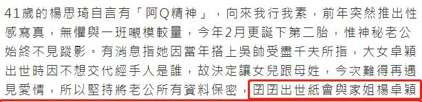 自从生下二胎后,杨思琦对于老公的身份是从来都没有暴露过,就连身边的友人都表示从来没见过杨思琦的老公,每次被追问什么时候带出来见面,杨思琦都表示对方是圈外人,要保持低调。