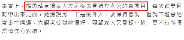虽然大家都没见过杨思琦的老公,不过杨思琦经常把老公挂嘴边,大赞老公对她很好,又很照顾家又疼小孩,更加感叹爱情没有对错。