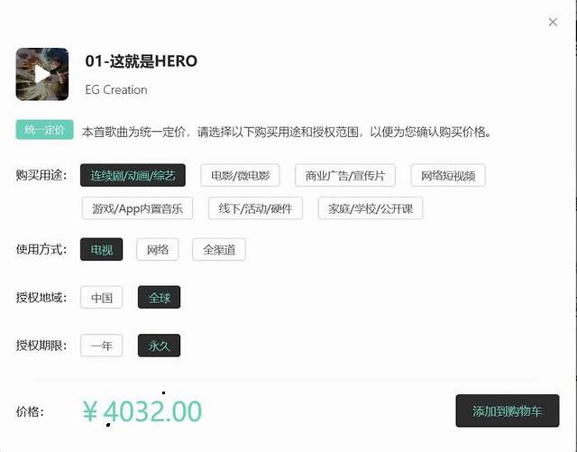 例如,在国内音乐版权商业发行平台VFine Music上,一首名为《这就是HERO》的背景音乐,如果选择购买用途为电视剧/动画/综艺、使用方式为电视、授权地域是全球、授权期限是永久的话,需要支付的版权价格为4032元。