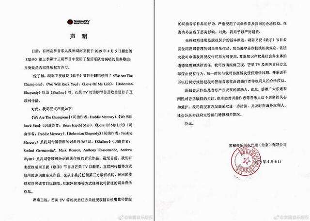 在综艺《一起乐队吧》中,有歌手翻唱了哪吒乐队《环形公路》,乐队成员随后发布多条微博指责节目组侵权:“哪吒乐队从没授权过任何节目,以任何形式,翻唱《环形公路》。”去年4月,索雅音乐也曾发声明称,《歌手》里翻唱使用了《Shallow》和皇后乐队的四首歌曲,但并没有获得授权许可。
