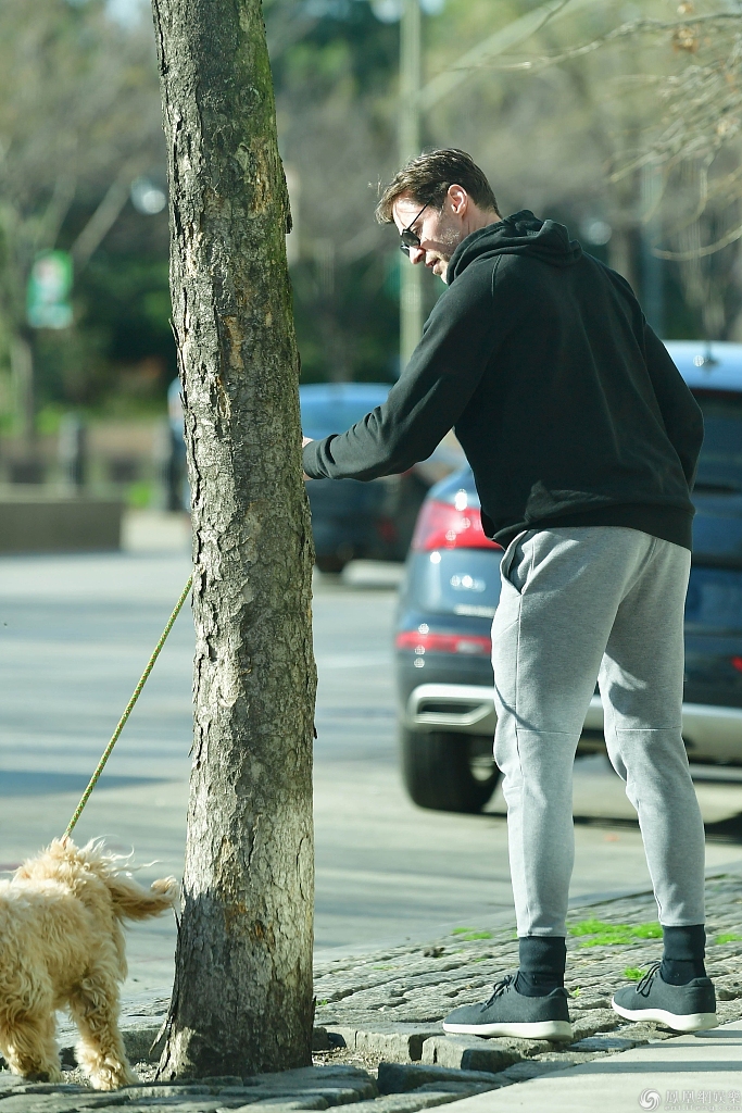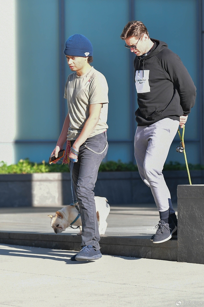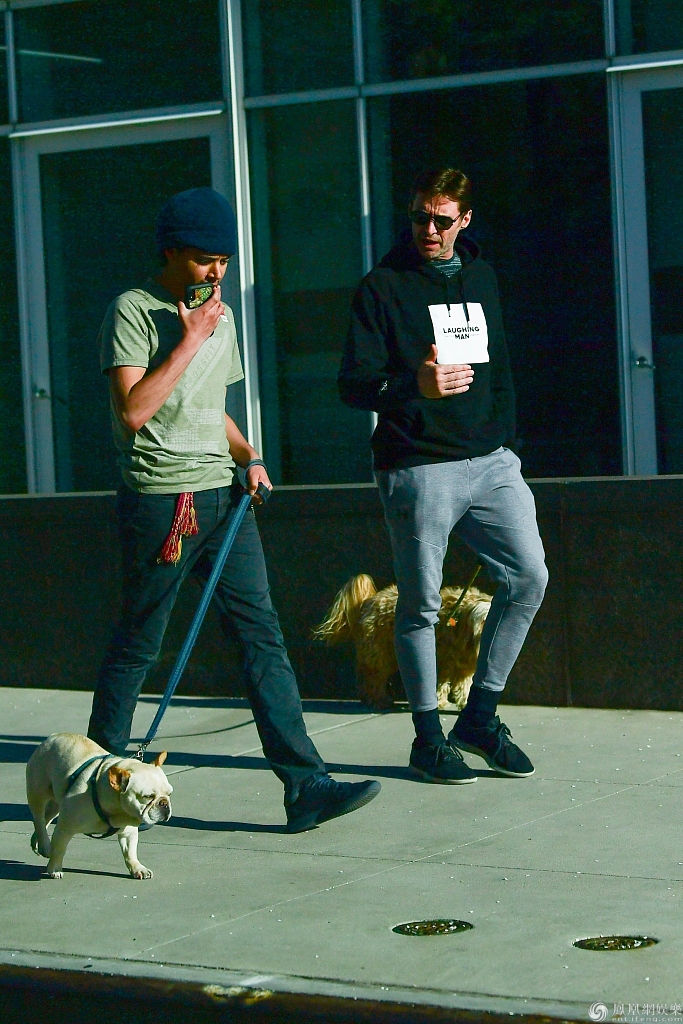休·杰克曼穿条纹T恤和黑色卫衣,手牵宠物狗,与儿子悠闲散步。