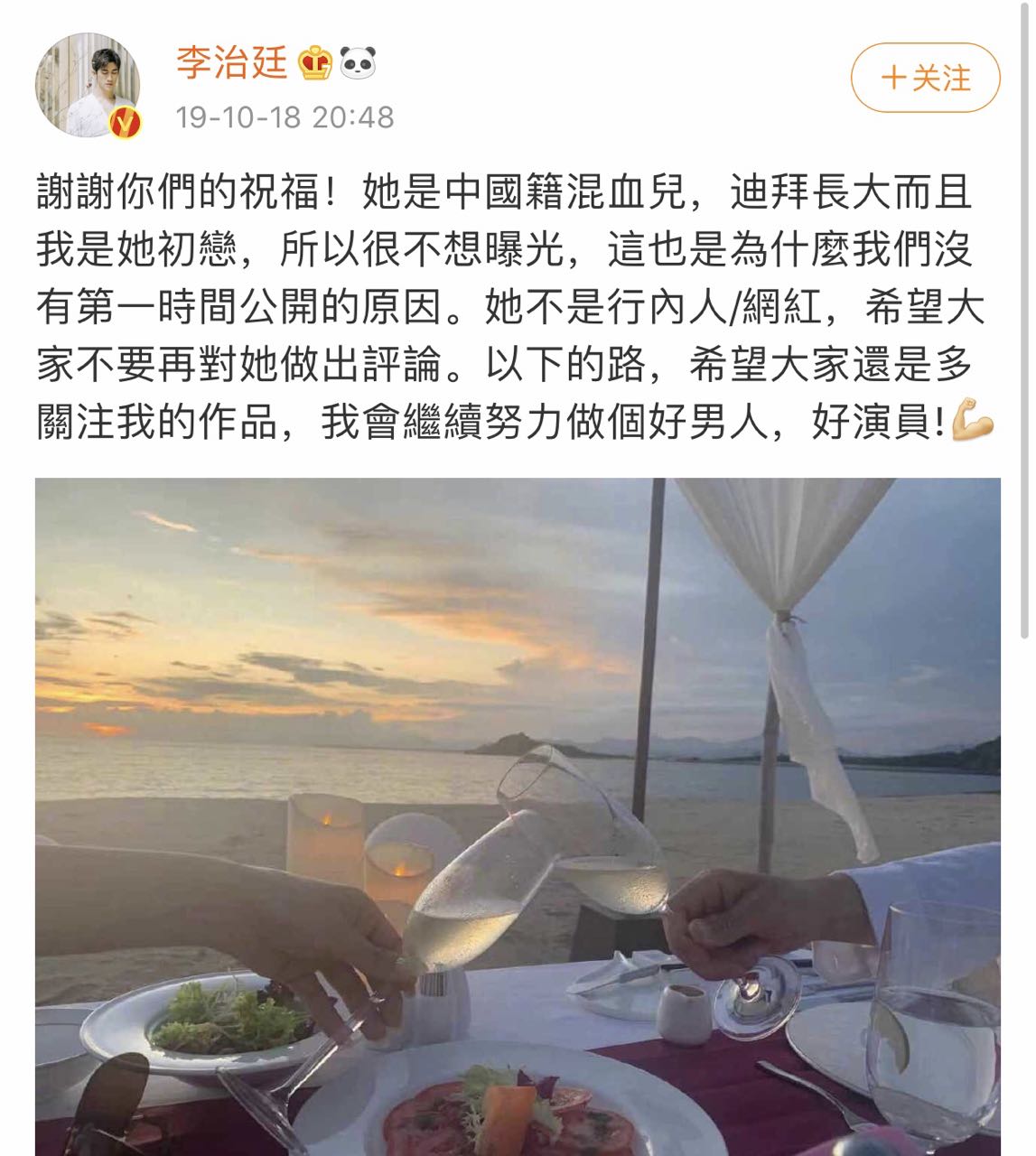 刚被媒体曝光亲吻照,李治廷就大方在个人社交媒体甜蜜认爱,他表示女方是中国籍混血儿,迪拜长大,自己也是她的初恋,但只是一个普通人,所以没有直接曝光,也希望大众对女友能够宽容。同时,他也表示自己会努力做好男人,好演员。