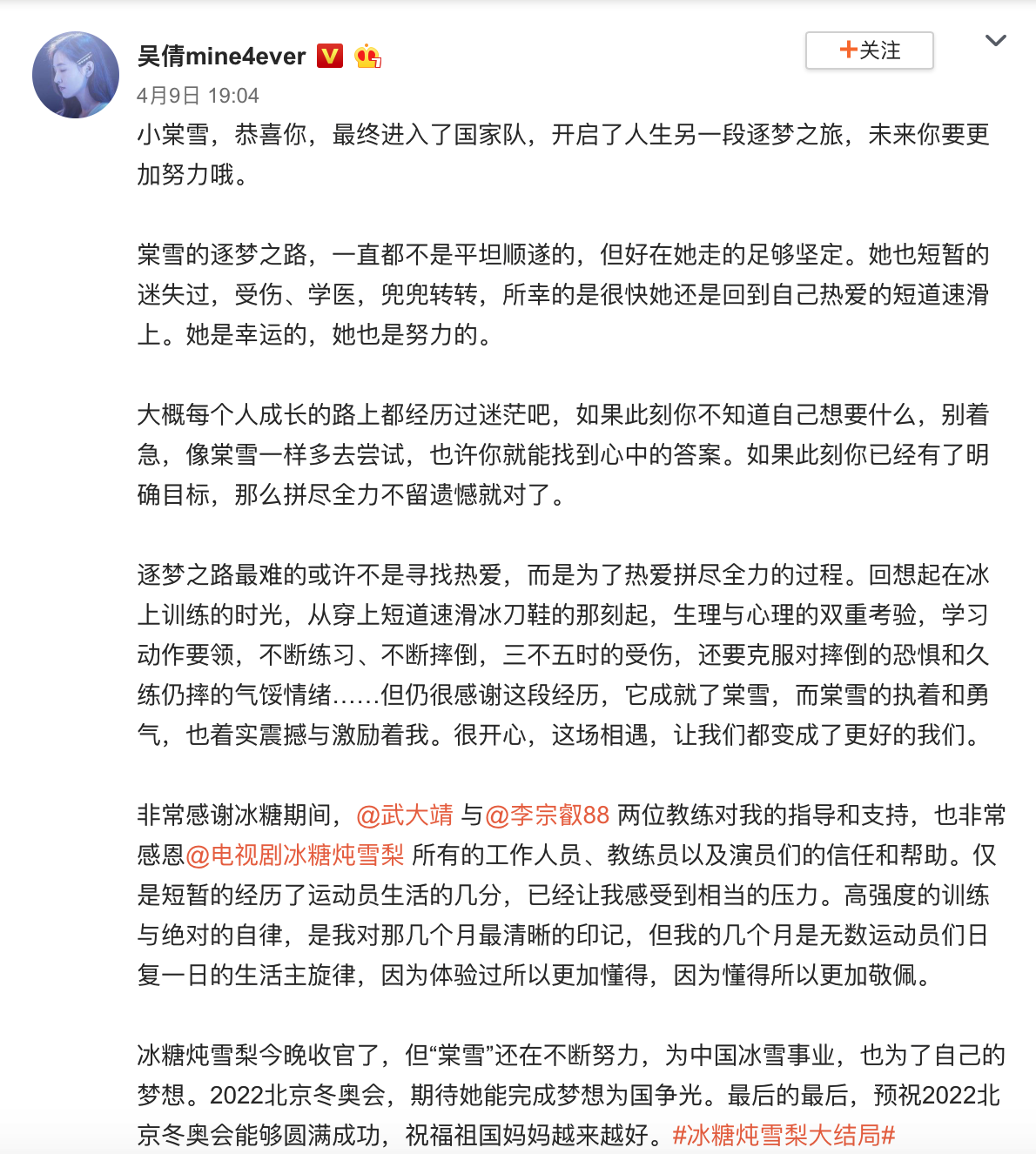 4月9日晚,吴倩晒《冰糖炖雪梨》剧照,并发表长文感慨棠雪一路走来的艰辛和努力。首先除了恭喜棠雪进入了国家队,并称:“感谢这段经历,它成就了棠雪,而棠雪的执着和勇气,也着实震撼与激励着我。很开心,这场相遇,让我们都变成了更好的我们。”