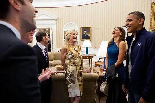 奥巴马在2012年4月举行的白宫记者晚宴上,与《摩登家庭》的主演索非亚·维加拉,朱莉·鲍恩和杰西·泰勒·弗格森一起笑了起来。
