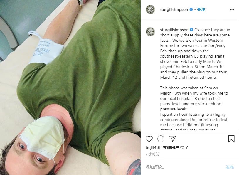 美国著名乡村歌手、曾经获得格莱美奖的斯特吉尔·辛普森(Sturgill Simpson),确认自己感染了新冠肺炎。当地时间本周六,斯特吉尔·辛普森在社交媒体上晒出了一张他戴着口罩、躺在病床上的照片,并且讲述了一个月前要求进行新冠病毒检测被拒绝的事情。