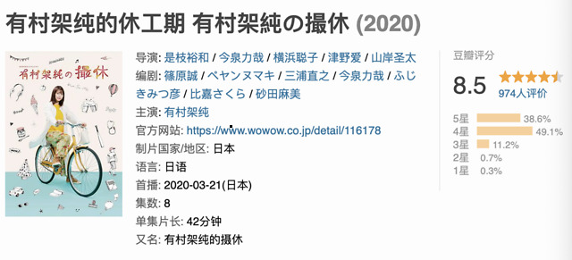 《有村架纯的休工期》,目前豆瓣只有近千人打分,开话评分就飚至8.5。