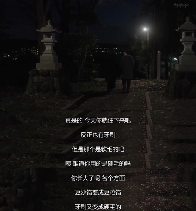 终于,有村架纯在夜色中向母亲轻轻的坦白道,原来饭桌上哥哥说的话与父亲对儿时的自己所说的一模一样,她“感到回忆被偷走了”。