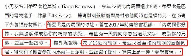 4月13日,据台媒报道,巴西著名球星内马尔52岁的妈妈在社交平台上高调秀恩爱,新欢对象比内马尔还小6岁,还是内马尔的忠实粉丝,这下“粉丝升级为继父”,还真是有些狗血